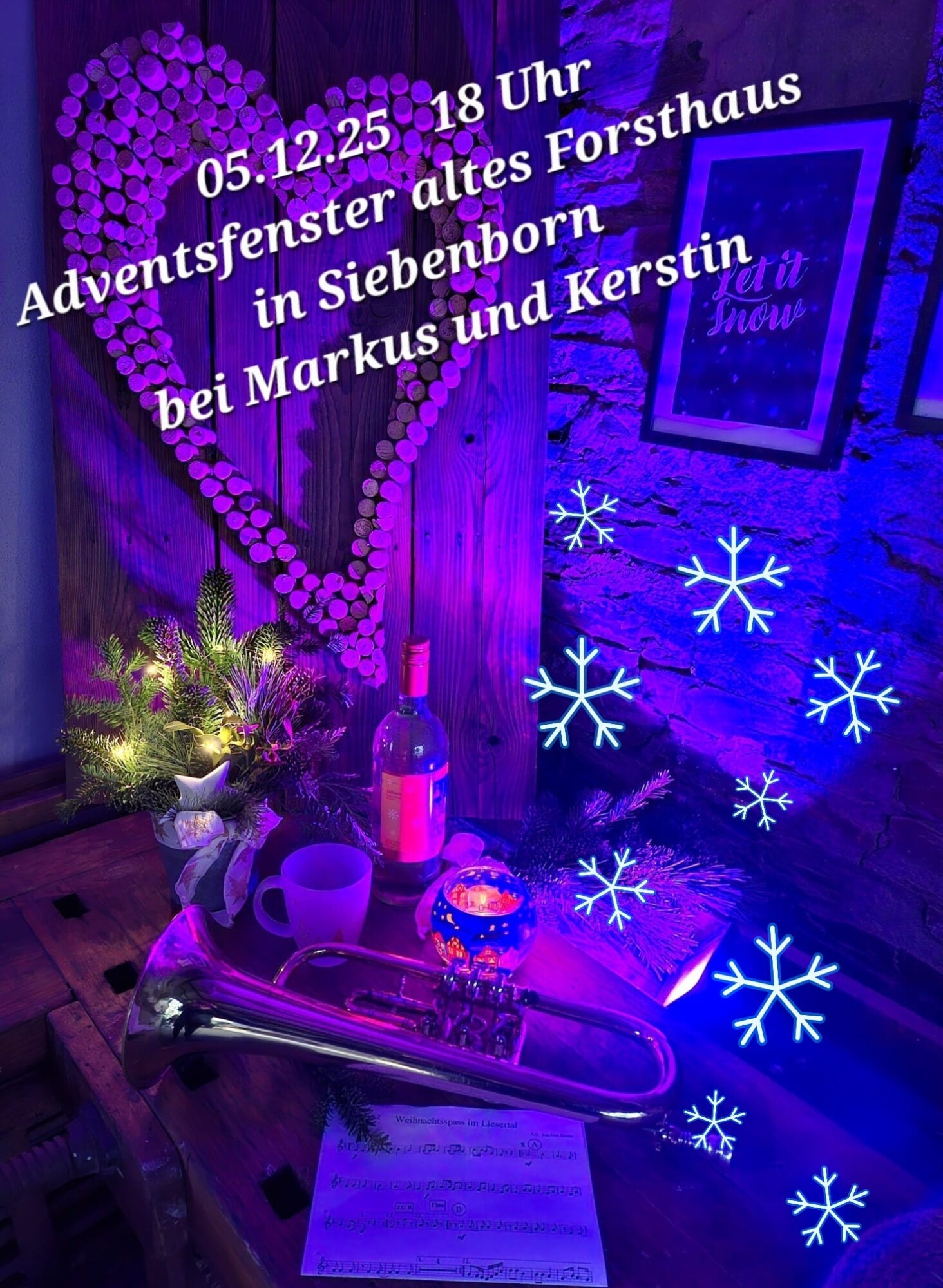 Das Adventsfenster vom 5. Dezember wird in Siebenborn bei Kerstin und Markus Barten geöffnet. Es erwarten Sie Glühwein, Punsch und Plätzchen