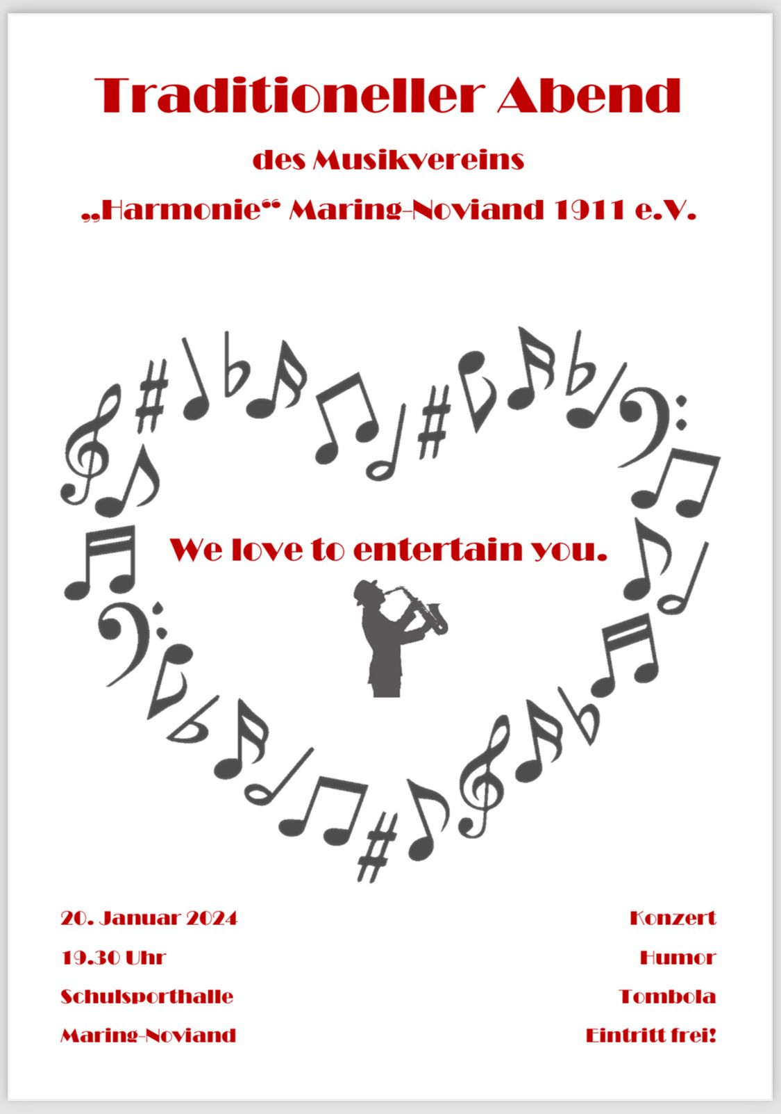 Der Musikverein „Harmonie“ Maring-Noviand 1911 e.V. veranstaltet am am 20. Januar 2024 ein Konzert.